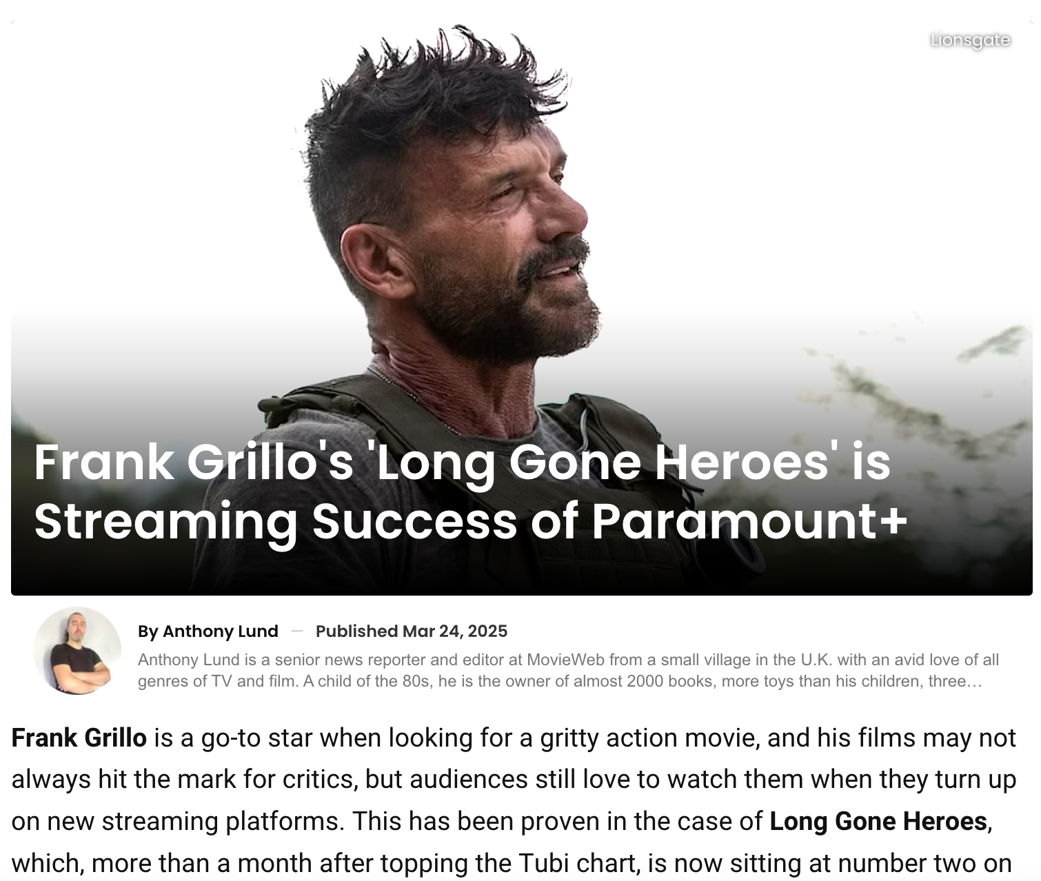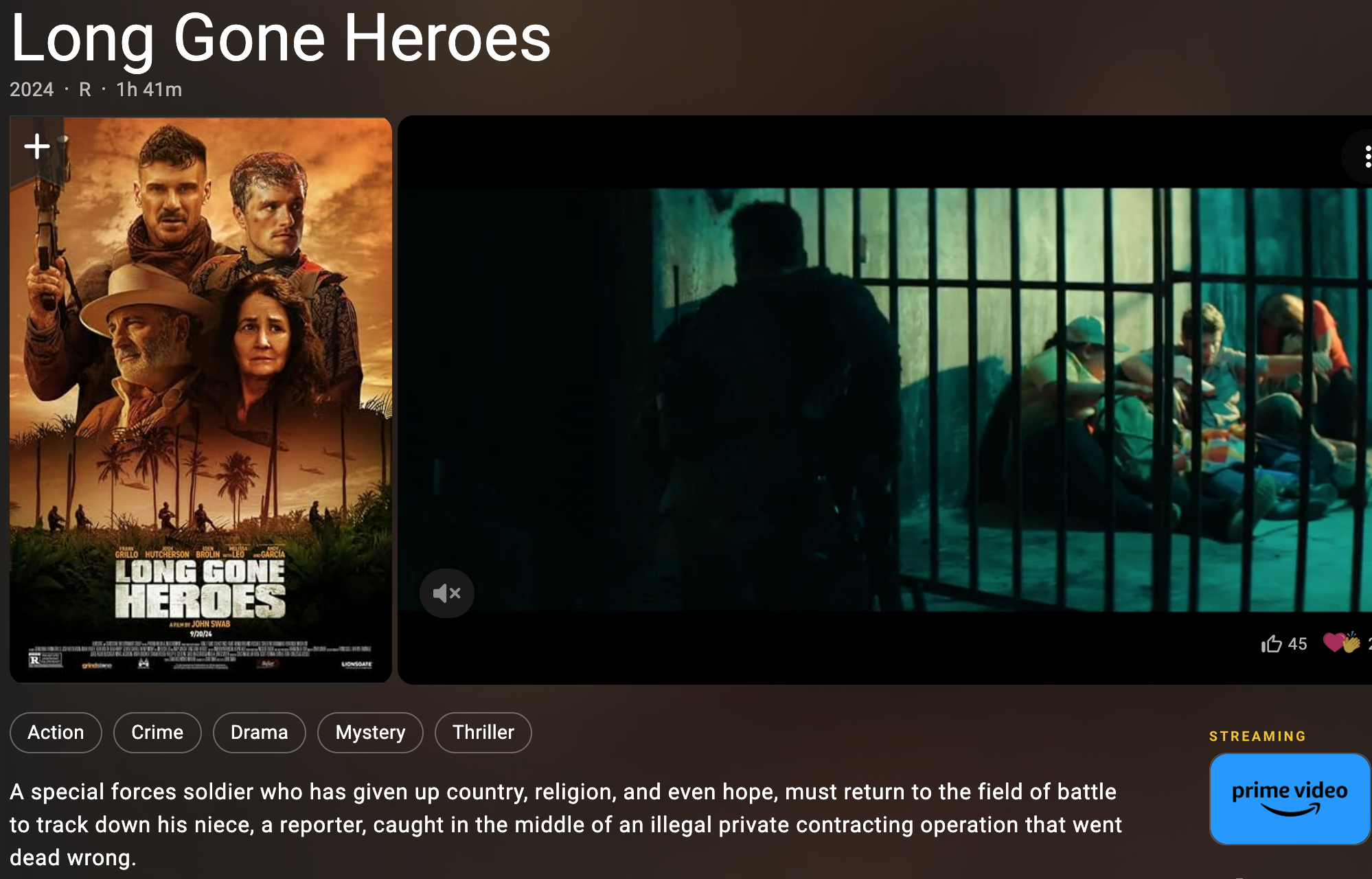 Long Gone Heroes is a 2024 American action-thriller film written and directed by John Swab, based on a story by Santiago Manes Moreno. The film stars Frank Grillo, Josh Hutcherson, Eden Brolin, Melissa Leo, and Andy García, and was produced by Perrenque Media Lab in Colombia. The plot follows a former soldier who assembles a team of mercenaries to rescue his niece, kidnapped by a drug lord in Venezuela. Distributed by LionsGate, the film was released in the United States in September 2024.